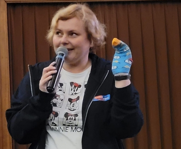Chętne dzieci przyniosły ze sobą pojedyncze skarpetki i opowiadały do mikrofonów w kształcie kostki wymyśloną przez nich historię danej skarpetki.