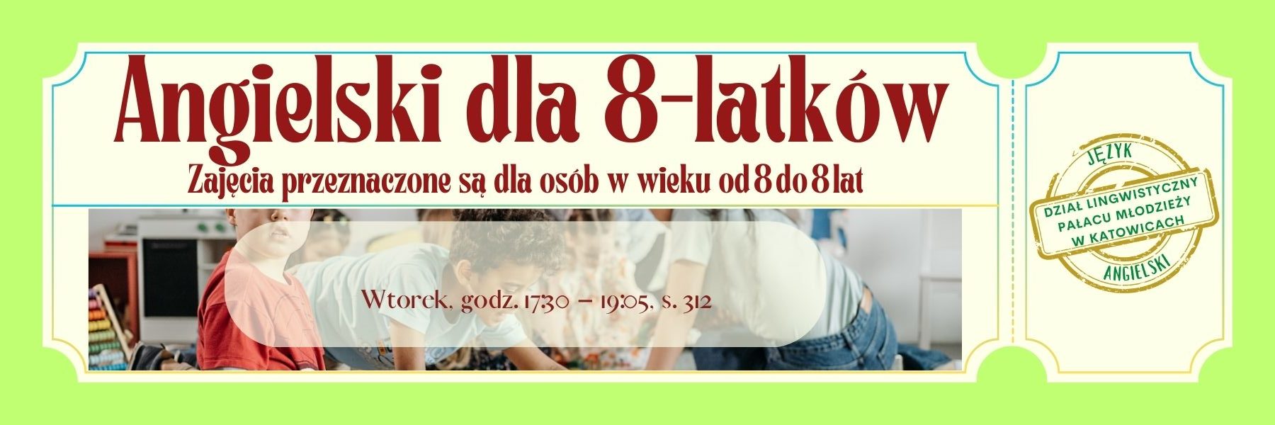 Zapisy na zajęcia odbywają się poprzez system rekrutacji na naszej stronie internetowej https://zapisy.pm.katowice.pl/ – w systemie rekrutacji wybierz „Język angielski”, a następnie „Angielski dla 8- latków”