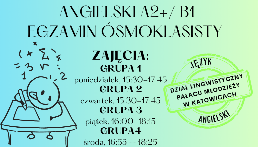 Zapisy na zajęcia odbywają się poprzez system rekrutacji na naszej stronie internetowej https://zapisy.pm.katowice.pl/ – w systemie rekrutacji wybierz „Język angielski”, a następnie „Egzamin ósmoklasisty gr. 1”